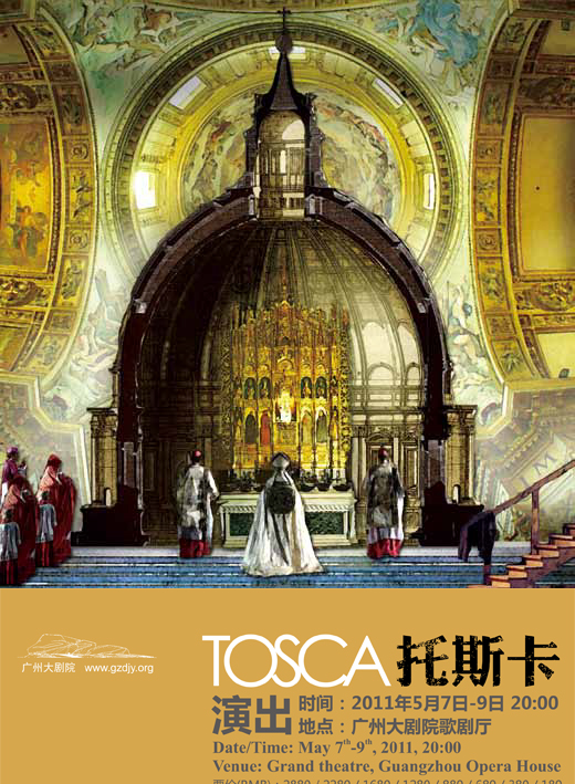 2011 年5 月,廣州大劇院開幕一周年之際,聯手《托斯卡》的首演劇院——羅馬歌劇院,共同打造全新版《托斯卡》。年輕的廣州大劇院投資逾千萬,力邀歐洲歌劇頂級班底和最當紅歌劇巨星,必將再造巔峰巨作。